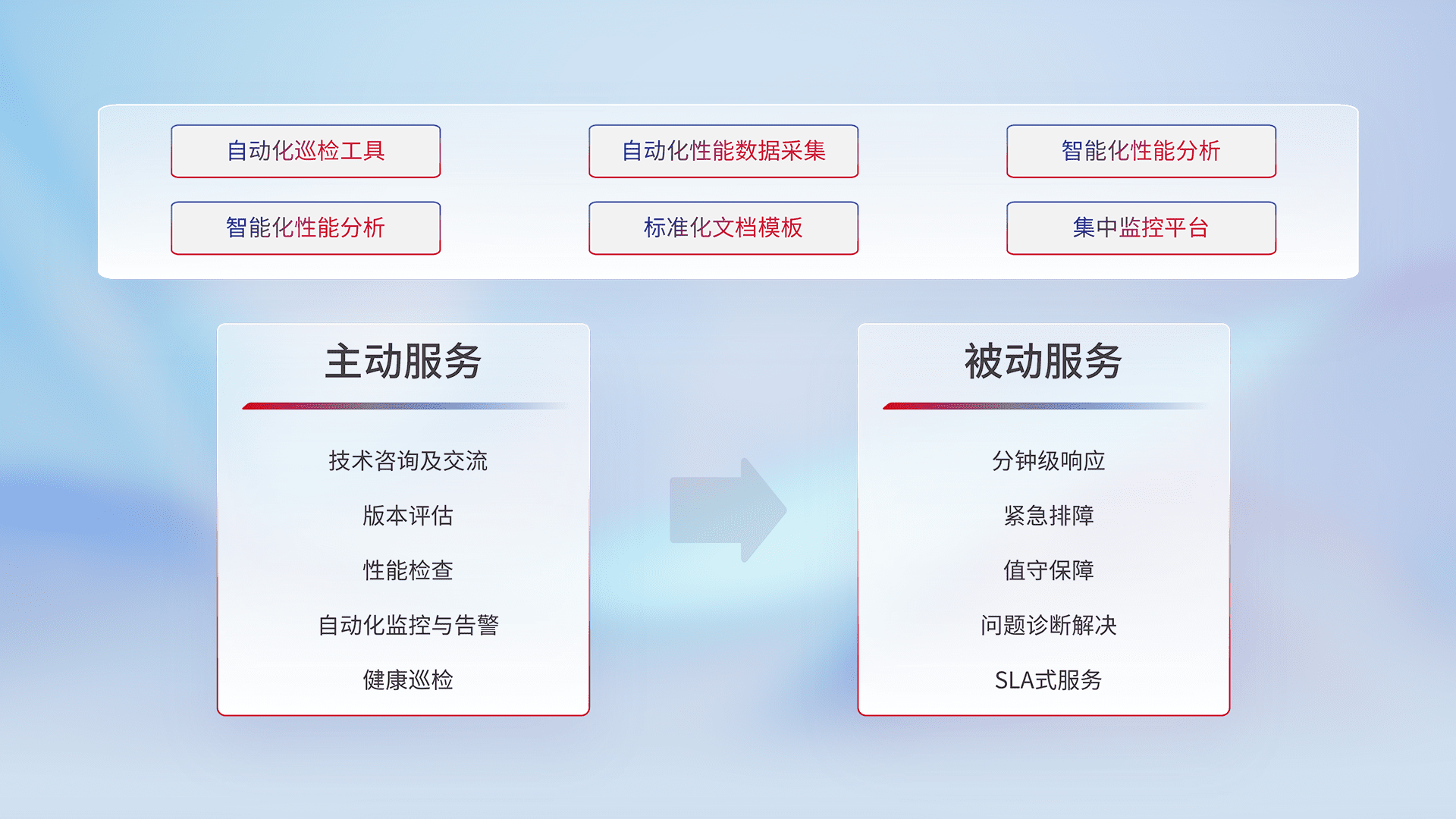 智能化工具和标准化文档,,保障服务质量,,提供主动服务(包含技术咨询、、版本评估、、性能检查、、、、自动化监控与告警、、健康巡检)和被动服务包含(分钟级响应、、、、紧急排障、、值守保障、、、问题诊断解决、、、、SLA服务)。。